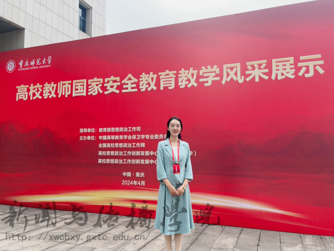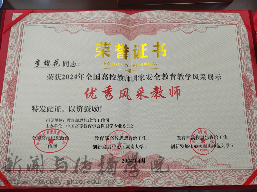 4月10日至12日,由教育部思想政治工作司指导,中国高等教育学会保卫学专业委员会、全国高校思想政治工作网、教育部高校思想政治工作创新发展中心联合主办的“2024年高校教师国家安全教育教学风采展示”在重庆师范大学举行。经过激烈角逐,必赢3003no1线路检测中心团委书记李樱花老师在2024年高校教师国家安全教育教学风采展示活动中荣获“国家安全教育教学优秀风采教师”,实现了我校教师在全国国家安全教育教学竞赛成绩的新突破。