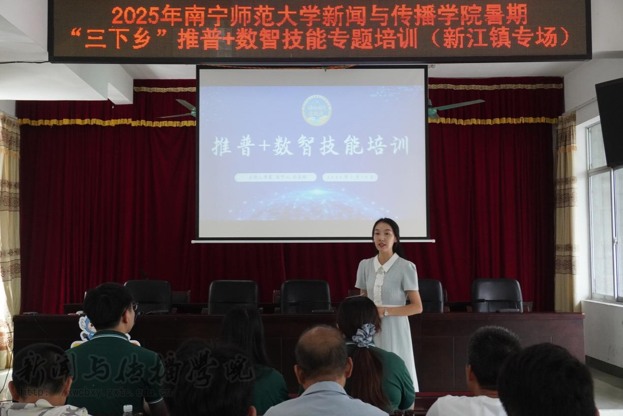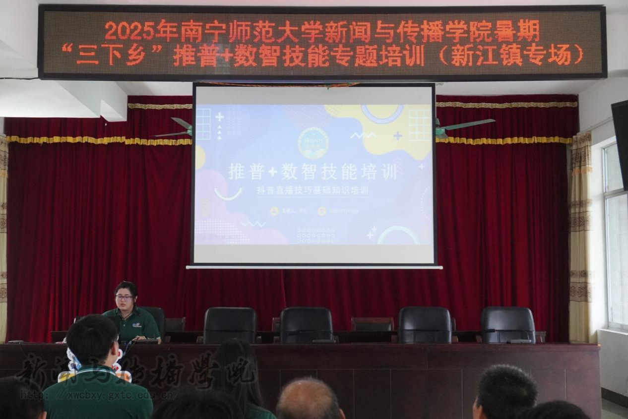 7月15日上午,必赢3003no1线路检测中心暑期“三下乡”“语”你同行实践团在邕宁区新江镇人民政府会议室开展“推普+数智技能培训”专题会。新江镇团委书记邓媛方、必赢3003no1线路检测中心团委书记李樱花,以及新江镇各村干部群众代表和 “语”你同行实践团成员到场参加。会议由新江镇团委书记邓媛方主持。本次培训会分为“直播技巧”“短视频拍摄”和“无人机使用”三部分。