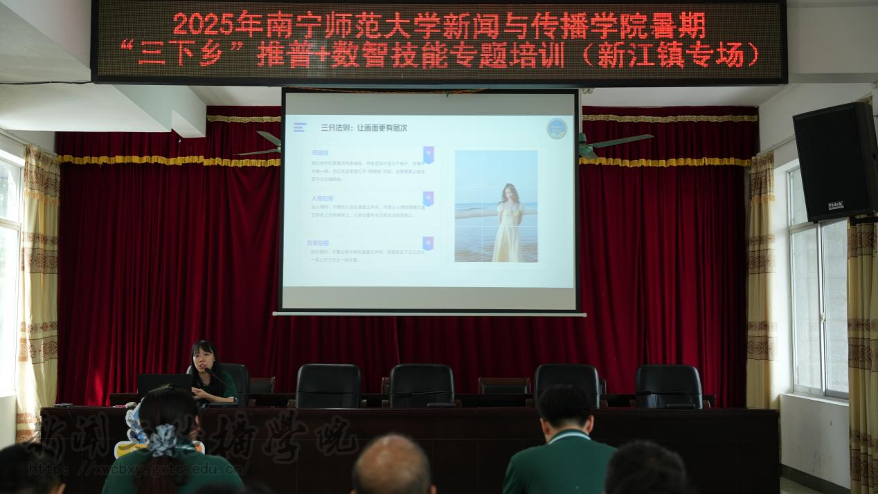 在“短视频拍摄”方面,实践团成员张可心从“短视频如何助力乡村振兴”导入,讲述短视频在乡村振兴中所发挥的强大影响力。她提到,新江镇嘹啰山歌文化具有很强的传播价值,可以将其作为短视频创作的题材,打造出特色民俗文化内容,实现更大范围的传播,进一步提升嘹啰山歌的知名度和影响力。