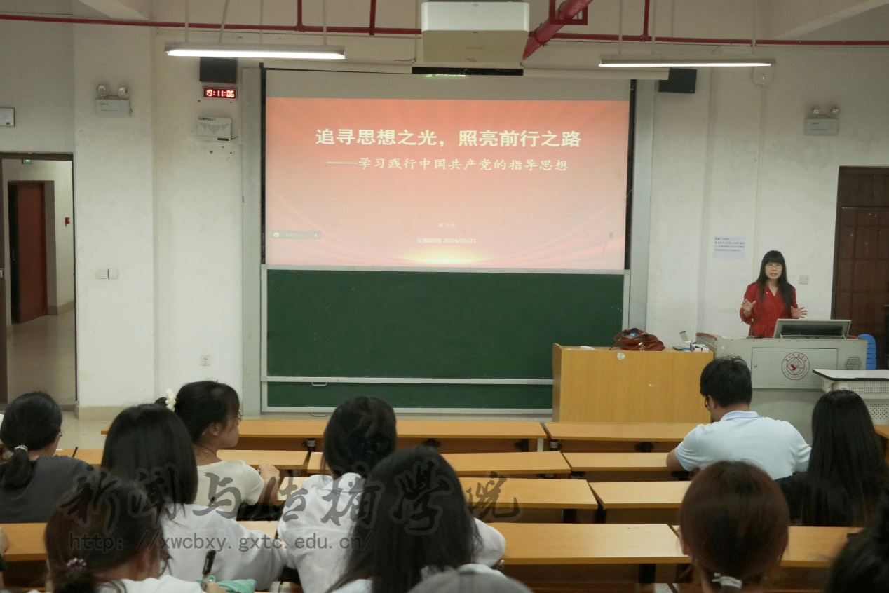 课上,周飞伶老师以“如何理解思想”为引,带领同学们深入学习中国共产党的指导思想。她从以下三个方面进行授课:一是解读党的指导思想如何与时俱进,回顾其发展的背景与过程。二是阐述了党的指导思想的内容,并强调学习贯彻党的指导思想的重要性。三是指出习近平新时代中国特色社会主义思想开辟了马克思主义中国化时代化新境界,详细讲解了“十个明确”、“十四个坚持”、“十三个方面成就”、“两个结合”及“六个必须坚持”的核心内容。