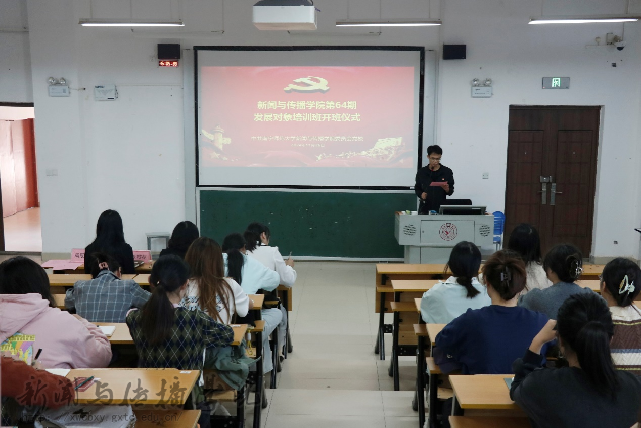 11月26日下午,必赢3003no1线路检测中心第64期发展对象培训班在文综楼1013教室举行。学院党委副书记黄敏、团委书记李樱花、本科生第一党支部书记李虹霏、本科生第二党支部书记周展林以及全体学员出席开班仪式。