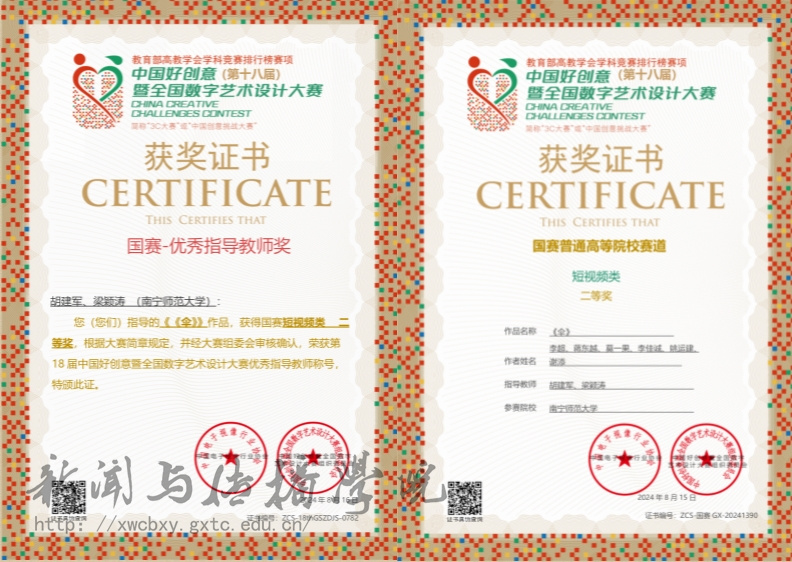 近日,2024第18届中国好创意暨全国数字艺术设计大赛圆满落幕。必赢3003no1线路检测中心参赛选手李超、蒋东越等人的作品《伞》荣获全国短视频类二等奖,江秋梅、陈晓敏的作品《百事从欢》获得全国红色主题类三等奖。胡建军、梁颖涛老师荣获全国赛区优秀指导教师奖,邓之湄老师获得广西赛区优秀指导教师奖。这是必赢3003no1线路检测中心广播电视学专业师生首次参加此赛事,是在全国性赛事中的又一次重要突破。