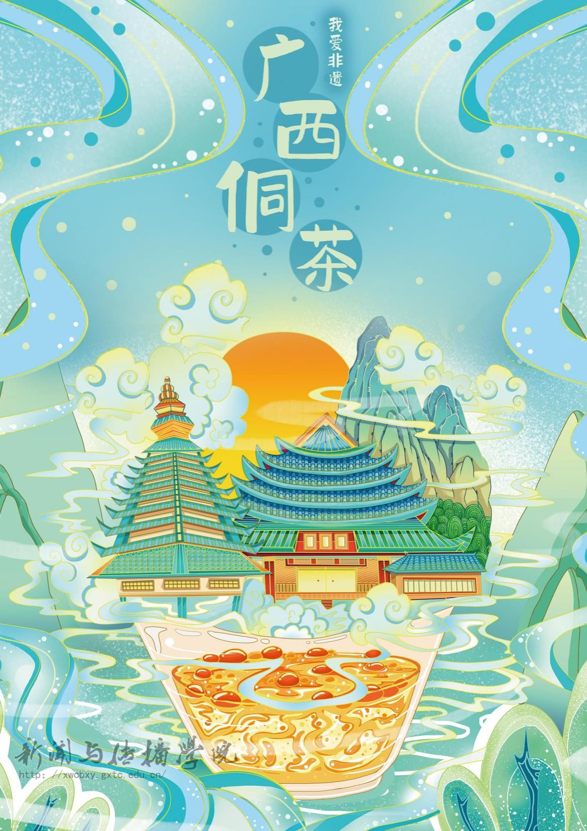 最后,来自22级广告专升本2班林芯桂同学的《我爱侗茶》取得一等奖,该作品将侗族传统建筑、自然景观和茶饮元素进行有机融合,巧妙地展现了广西的非遗特色和文化底蕴。