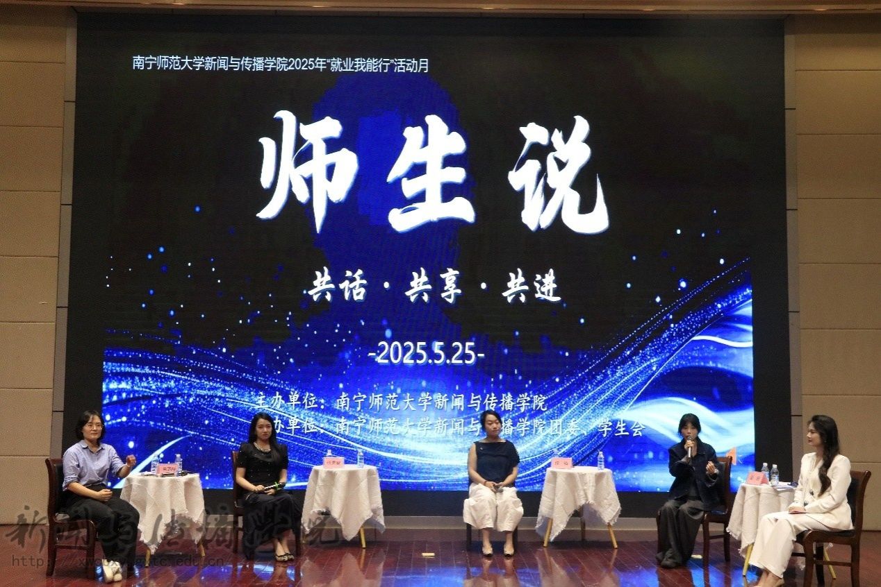 5月25日晚,必赢3003no1线路检测中心在文综114报告厅举办“就业我能行”活动月之“师生说”访谈会。学院党委副书记黄敏、院长助理宋丽丽、团委书记李樱花、学工办辅导员兰浩玮以及2011届新闻学专业佟镝、2021届播音与主持艺术专业张灵智、2022届广告学专业麦昕三位毕业生代表到场参加。