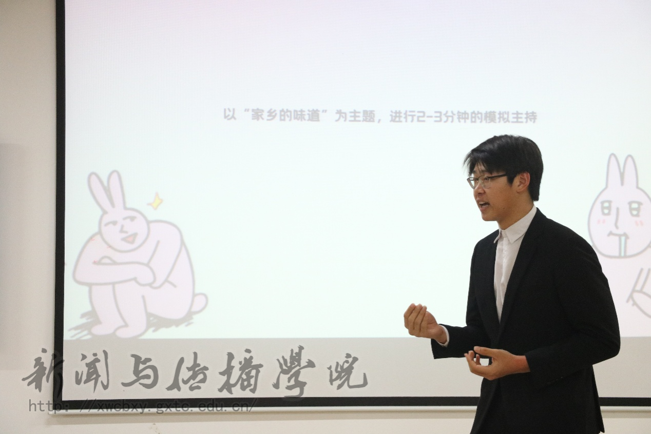 课上,两位主讲人从主持基本功切入,围绕发声训练展开教学。助教通过示范“数枣法”“绕口令”等练习方法,引导同学们掌握科学发声技巧,强化唇舌力度与气息控制。随后,主讲人提到,要重视主持仪态管理,男生主持所穿西装要得体整洁、站姿挺拔,女生主持可穿亮色礼服或简约西装裙,通过服饰展现主持的风格风采。此外,课堂设置“中华经典诵读比赛”、“家乡的味道”等模拟主持环节,让同学们从实践中汲取经验。