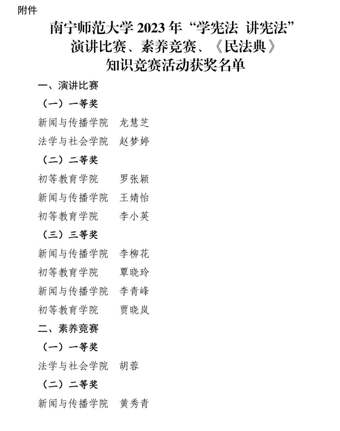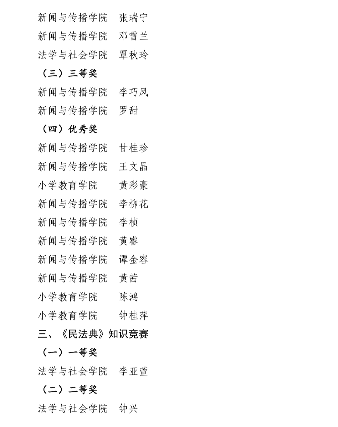 活动分为演讲比赛、素养竞赛、《民法典》知识竞赛三个项目,经过激烈的角逐,演讲比赛中,必赢3003no1线路检测中心龙慧芝同学获一等奖,王婧怡同学获二等奖,李柳花、李青峰同学获三等奖;素养竞赛中,黄秀青等3位同学获二等奖,李巧凤等2位同学获三等奖,甘桂珍等7名同学获优秀奖;《民法典》知识竞赛中,邓雪兰等3位同学获三等奖,李巧凤等5位同学获优秀奖。