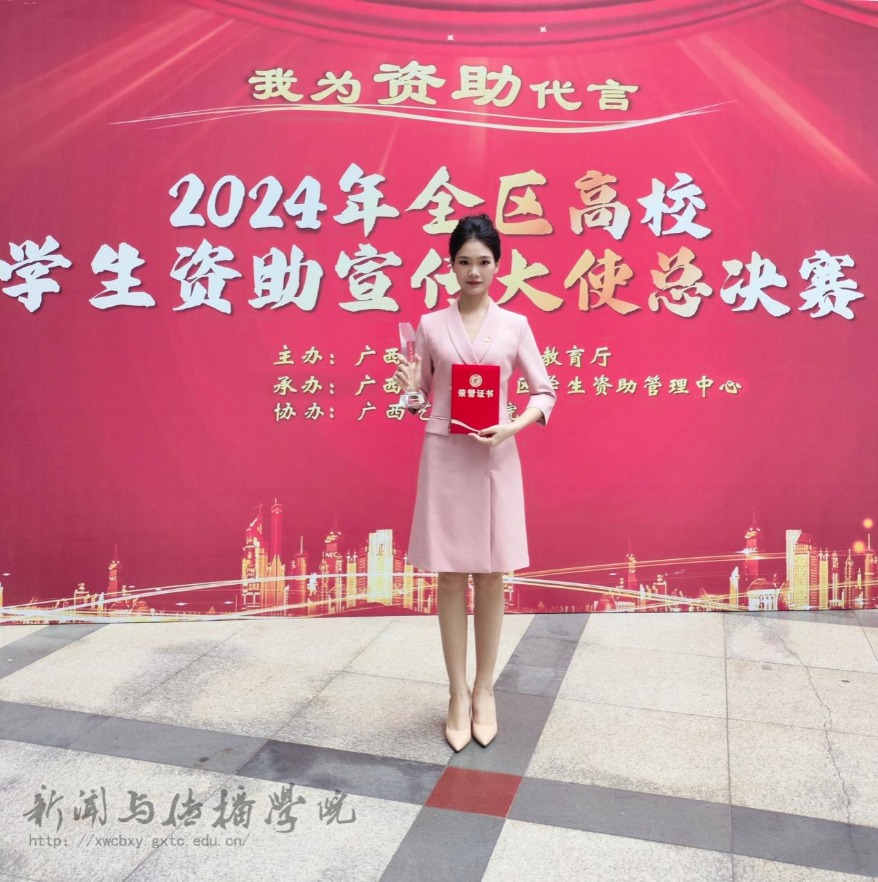 11月24日,来自必赢3003no1线路检测中心2021级播音与主持艺术专业的莫铭同学代表学校参加了2024年“我为资助代言”全区高校学生资助宣传大使总决赛,并获得“广西十佳学生资助宣传大使”称号。