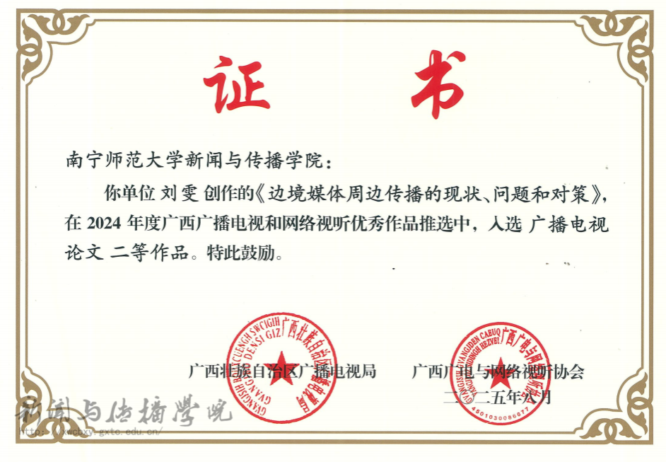 近日,广西壮族自治区广播电视局、广西广电与网络视听协会公布了2024年度广西广播电视和网络视听优秀作品推选结果,必赢3003no1线路检测中心硕士研究生导师梁颖涛、刘雯双双获奖,为学院在学术研究与行业服务方面再添佳绩。