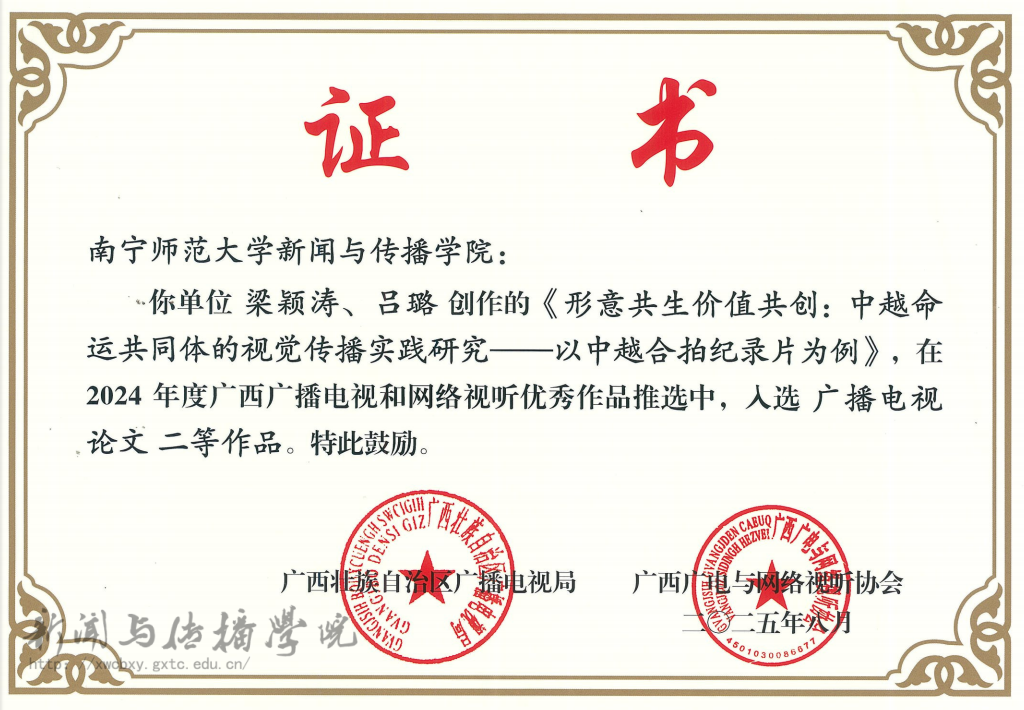 在此次评选中,梁颖涛院长的论文《形意共生 价值共创:中越命运共同体的视觉传播实践研究——以中越合拍纪录片为例》,聚焦跨文化传播语境下的纪录片合作与叙事创新,从价值共创和命运共同体视角探讨了中越纪录片合作的传播路径,展现了鲜明的学术创新与现实关怀。刘雯老师的论文《边疆媒体周边传播的现状、问题和对策》,立足边疆传播实践,深入剖析了当前边疆媒体在周边国家传播中的优势与不足,并提出针对性的对策建议,体现了服务国家战略与区域传播的实践价值。
