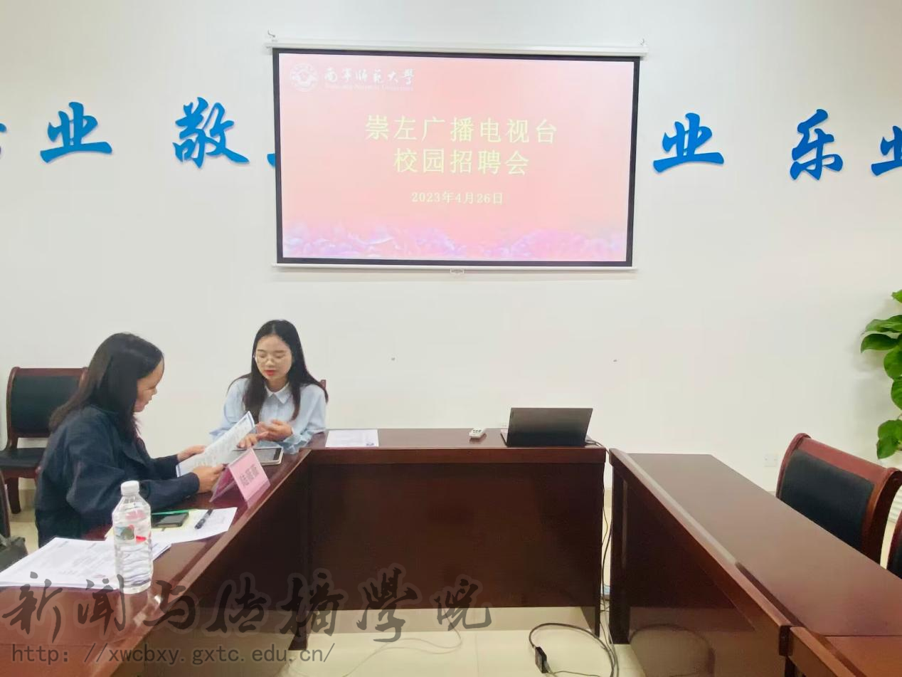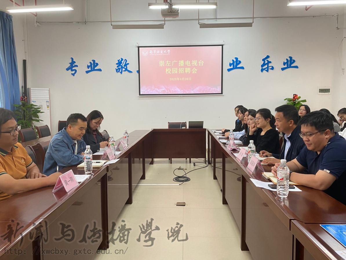 4月26日上午,崇左广播电视台校园招聘会暨2023届毕业生就业双向洽谈会在我校五合校区理综楼304举行。崇左市广播电视台台长助理、新闻中心主任黄绍康,融媒体中心主任陆薇薇,融媒体中心副主任黄一刚一行三人来必赢3003no1线路检测中心洽谈毕业生就业工作,学院党委副书记、院长徐健,副院长梁颖涛,辅导员陈丽珍以及部分学生代表参加此次就业洽谈会。